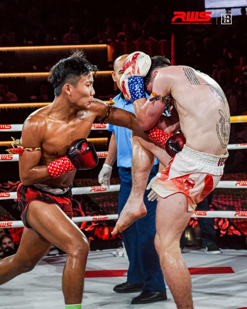 การต่อสู้ มวยซ้ายฝีมือครบเครื่องตีนซ้ายหน้าดีขวางหน้าสับศอกหมัดต่อยแม่นหลักเหลี่ยมดีกว่า ''พี่ชายมังกรเหล็ก เปิ้ลนคร'' -